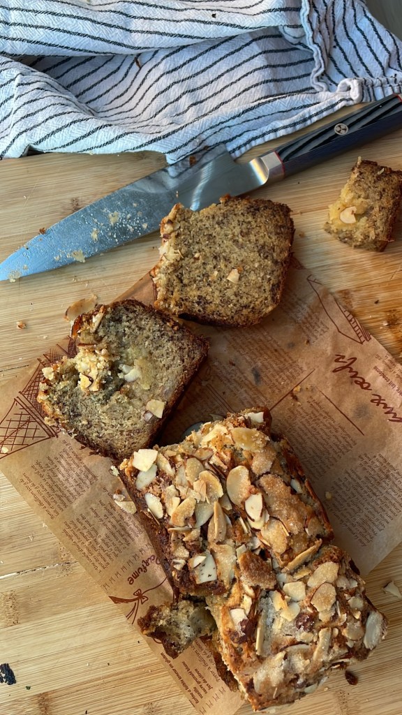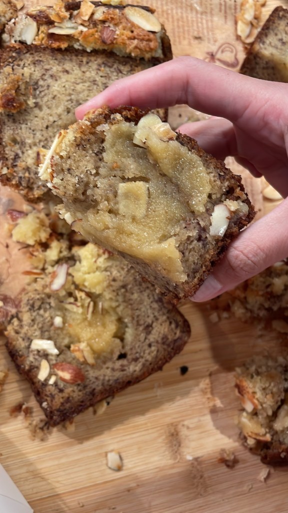 - Or you can pour the whole banana bread batter into the prepared loaf pan and then spread the almond filling evenly over the banana bread batter