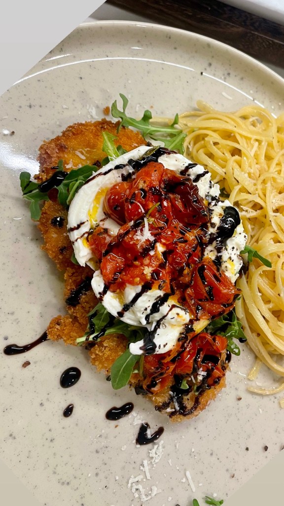 - Top each chicken Milanese with a bed of arugula salad, top with the burrata and the tomato confit! Add some balsamic glaze on top and enjoy! I served with a side of Linguine al Limone