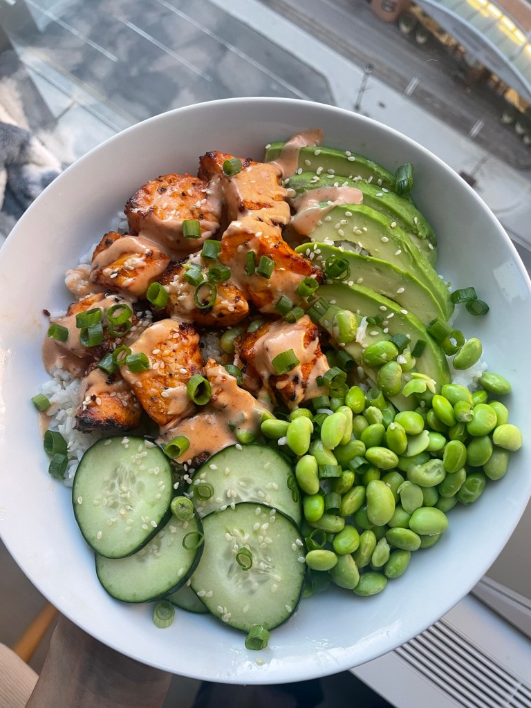 – I served it with rice, Asian cucumber salad, edamame and avocado. Plus topped with sesame seeds and green onions!