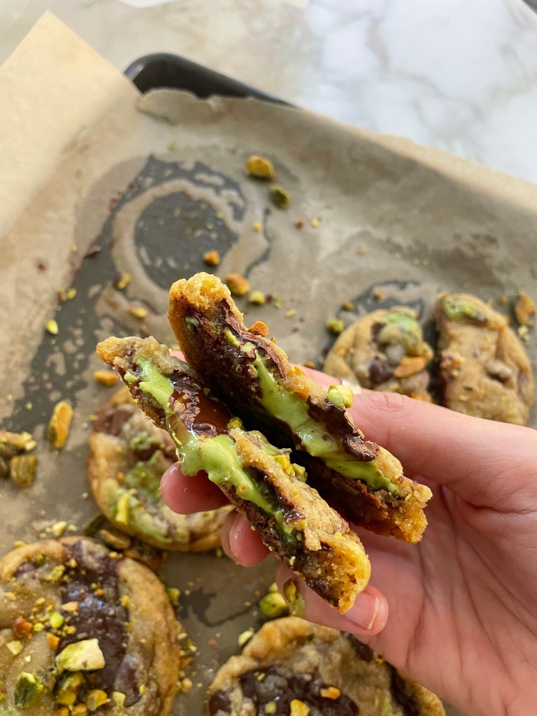 – Scoop about 2 tbs dough, fill with frozen pistachio cream, seal completely.