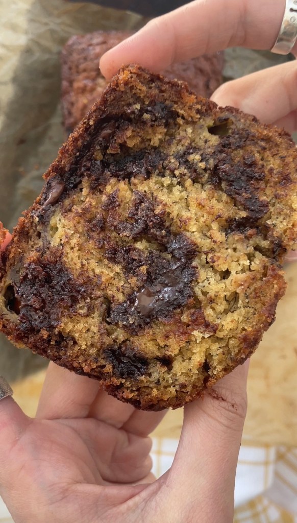- Line a 9 × 5-inch loaf pan with a parchment sling for easy removal. Spoon in the batter, level the top, then scatter over the reserved chips and the demerara sugar.