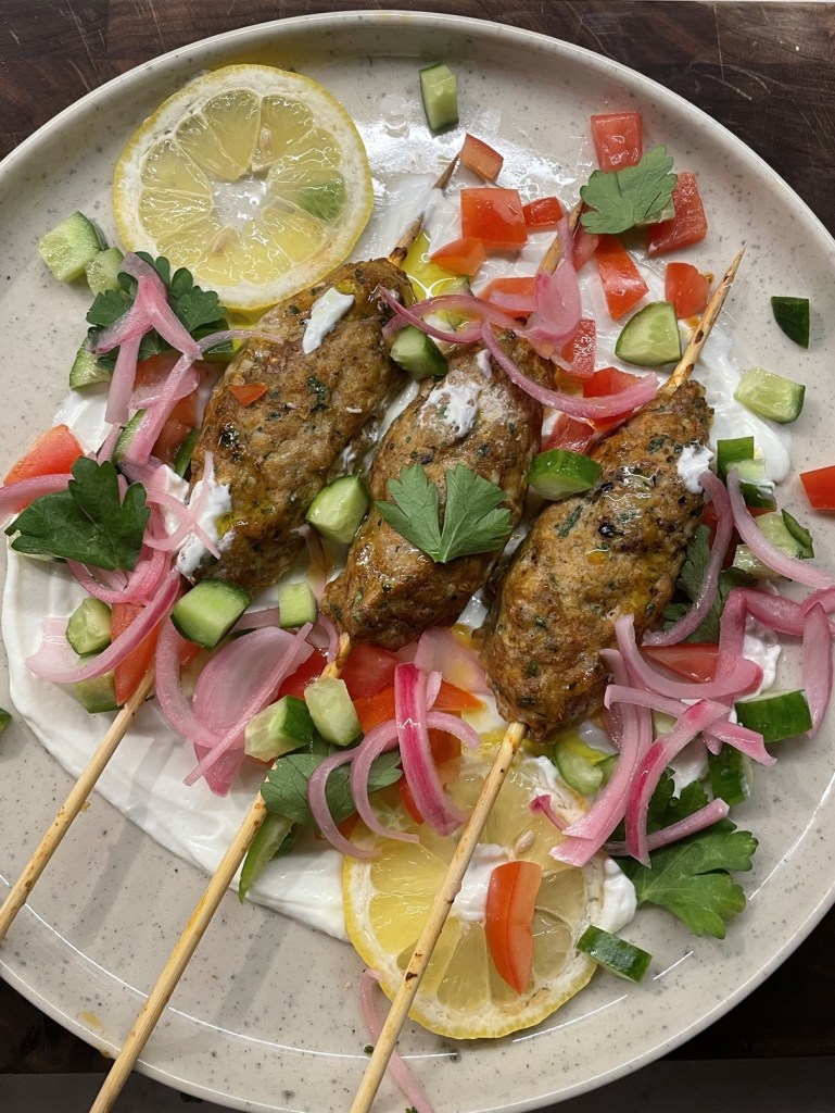 Juicy, spiced chicken skewers baked to perfection! Perfect for summer dinners served with yogurt sauce, tomato-cucumber salad, and fluffy pita.